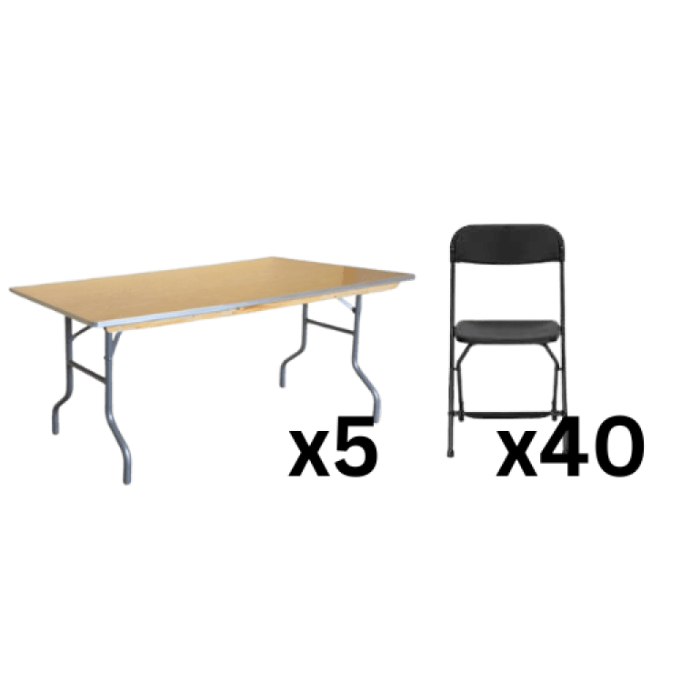 40 Guest SeatingBlack Folding Chair & 6 ft Table Seating Package:40 Guest Seating102587981_2909179_29196531000 Experience 40 Guest Seating—a setup that delivers a smooth, organized array of chairs designed to comfortably host your event guests, making any gathering both stylish and welcoming.