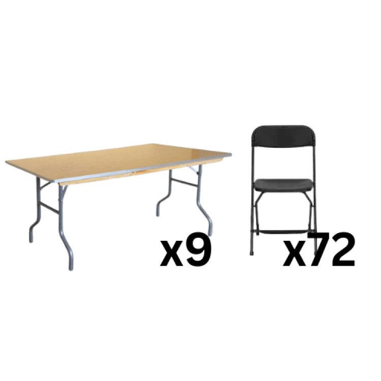 72 Guest SeatingBlack Folding Chair & 6 ft Table Seating Package:72 Guest Seating102587981_2909179_29196691000 This seating option sets the stage for any event by providing comfortable, well-arranged spots for up to 72 guests, making sure everyone can enjoy the celebration with ease.