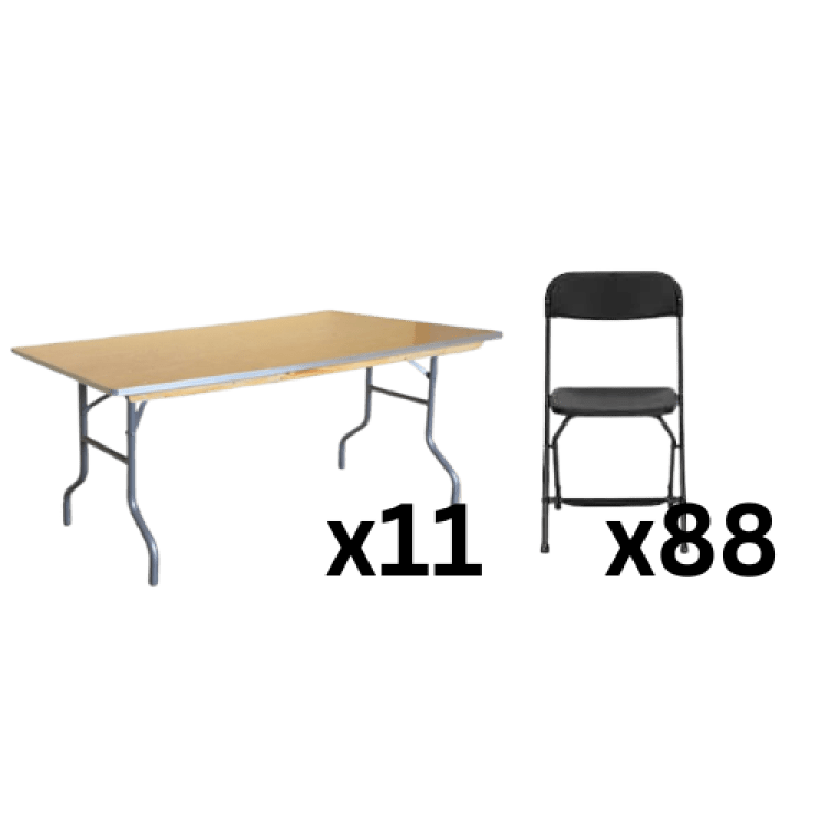 88 Guest SeatingBlack Folding Chair & 6 ft Table Seating Package:88 Guest Seating102587981_2909179_29196771000 Perfect for large events, this 88 guest seating arrangement offers ample space for everyone to sit and enjoy the occasion. Whether you're hosting a wedding, corporate event, or family gathering, these setups bring comfort and style to every venue.
