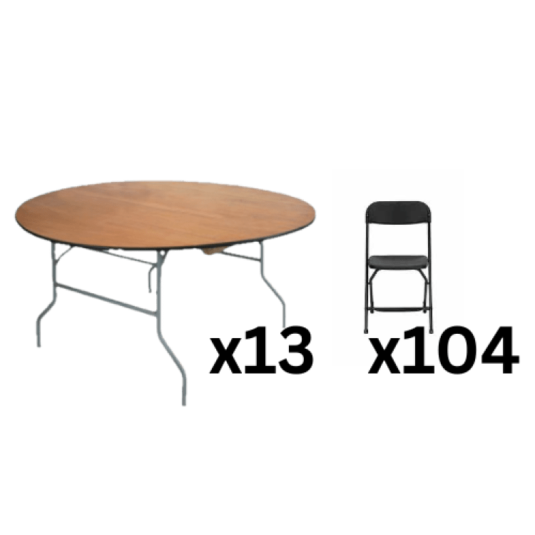 96 Guest SeatingBlack Folding Chair & 60 in Round Table Seating Package:96 Guest Seating102587999_2909181_29170701000 A complete seating setup with enough chairs and tables to comfortably accommodate up to 96 guests, perfect for parties, receptions, or large gatherings.