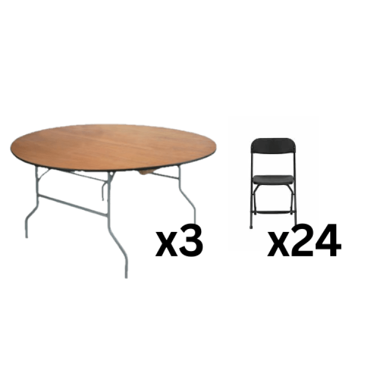 24 Guest SeatingBlack Folding Chair & 60 in Round Table Seating Package:24 Guest Seating102587999_2909181_29170381000 Comfortable seating arranged to accommodate up to 24 guests, perfect for keeping everyone together during meals, ceremonies, or group activities.