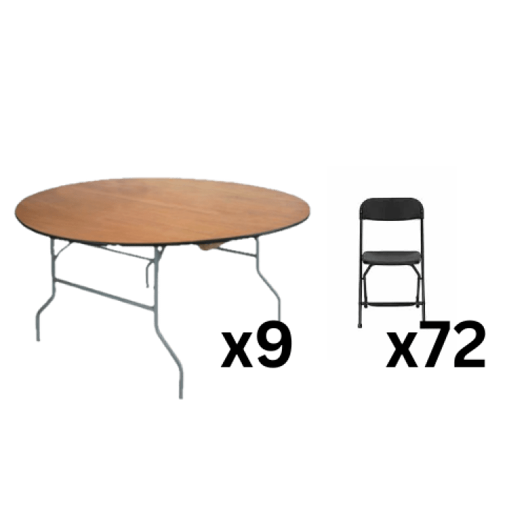 64 Guest SeatingBlack Folding Chair & 60 in Round Table Seating Package:64 Guest Seating102587999_2909181_29170481000 A complete seating setup that provides enough chairs for up to 64 guests, perfect for keeping everyone comfortable during parties, weddings, or large gatherings.