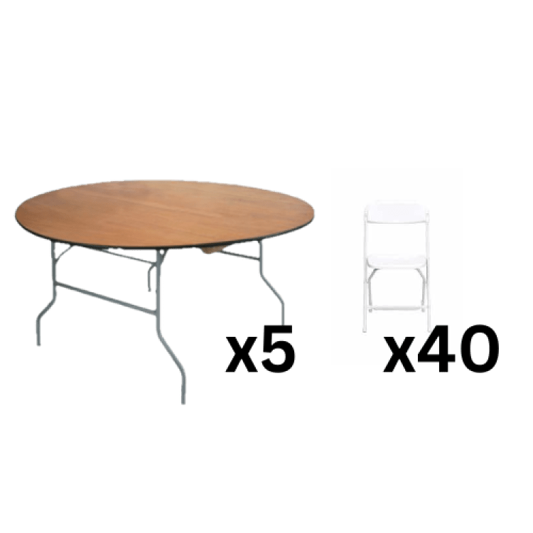 40 Guest SeatingWhite Folding Chair & 60 in Round Table Seating Package:40 Guest Seating102588003_2909193_29170841000 A complete seating setup to comfortably accommodate up to 40 guests, perfect for meals, ceremonies, or group gatherings.