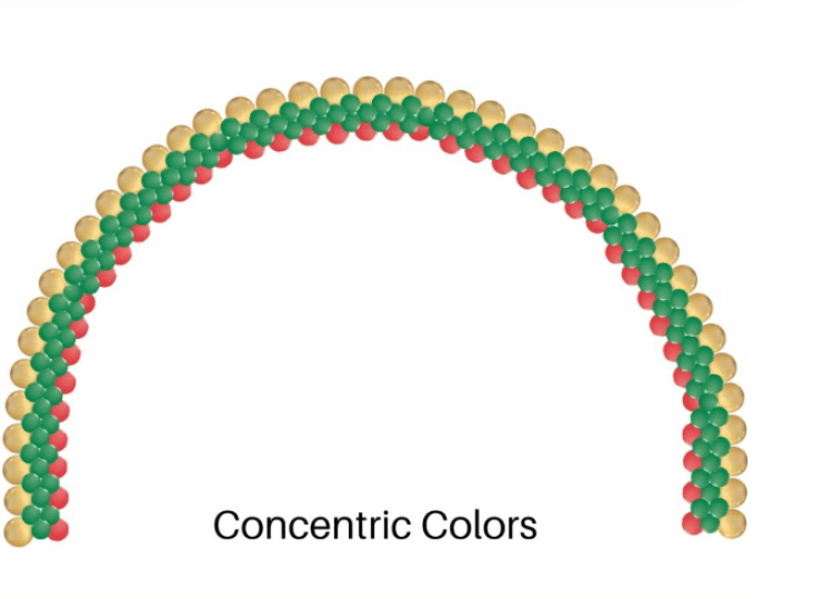 ** price per foot **Flat Arch - Concentric Colors (3 Color)(Priced per linear foot) using 11" standard color latex balloons downsized to approximately 8"(air-filled) 4 up in spiral column (or other design option if noted). Standard latex colors included. Other specialty balloon colors, balloon materials or sizes can be added at an additional fee. Does NOT include tax, installation, removal or outdoor anchoring. All framework, bases and weights must be returned to avoid being charged replacement fees.