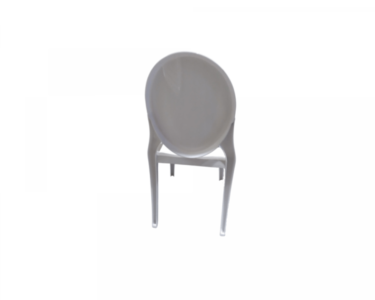 White resin chair with a round circular back and a molded plastic seat one piece chair. The rounded back evokes the shape of antique medallions, while the seat provides a contrasting linear shape.